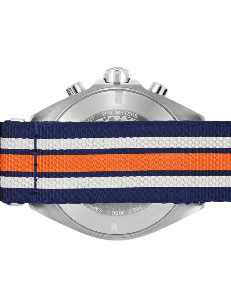 The TAG Heuer Formula 1 43 mm Quartz Chronograph features a bold blue dial in a stainless steel case with a matching NATO strap. Equipped with a quartz chronograph movement, tachymeter bezel, luminous markers, and 200 m water resistance, it delivers sport-inspired performance and modern style.
